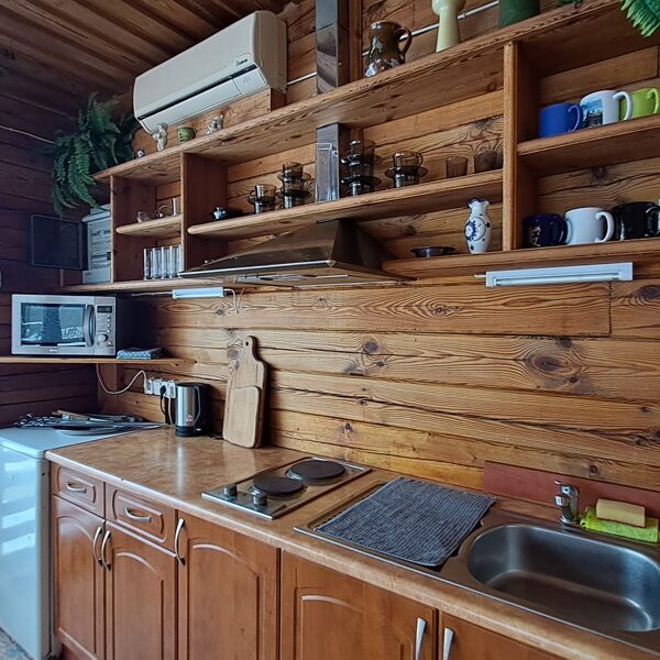 - Namelyje įrengta virtuvėlė, kurioje rasite visus reikiamus daiktus: indus, įrankius serviravimui, mikrobangų krosnelę, kaitlentę ir kt..