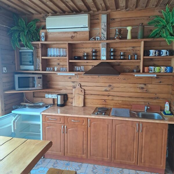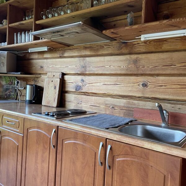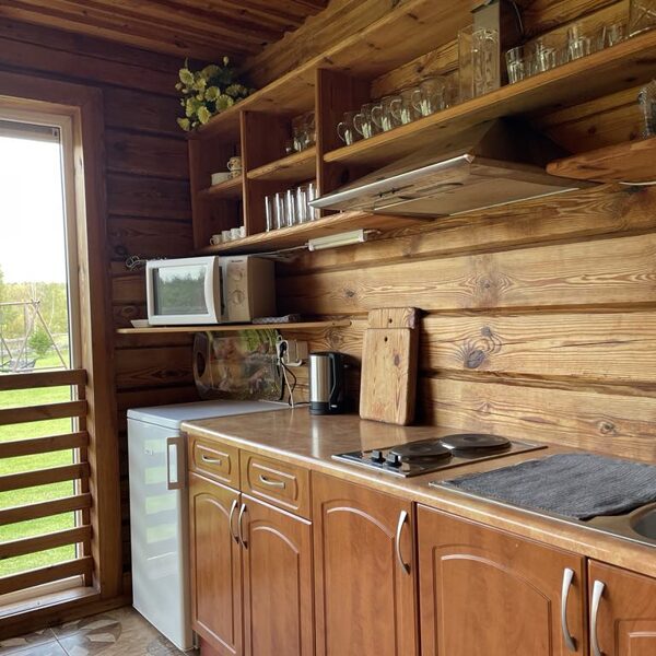 - Namelyje įrengta virtuvėlė, kurioje rasite visus reikiamus daiktus: indus, įrankius serviravimui, mikrobangų krosnelę, kaitlentę ir kt.